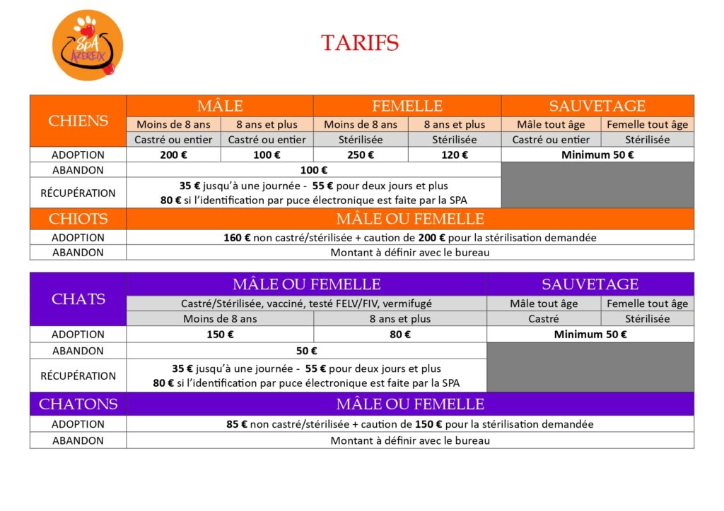 Une participation financière aux frais vétérinaire et à la vie du refuge est demandée :